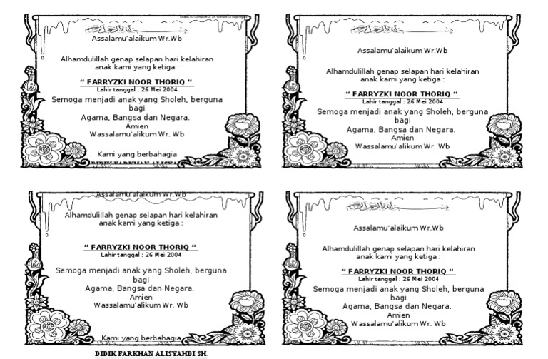 Ucapan syukuran kelahiran bayi untuk acara aqiqah atau selapanan si buah hati menerima jasa desain hubungi 6282222205210 kartu bayi kelahiran anak bayi Download gambar background selapanan cropped wallpaper gambar lucu gambar animasi kartun lucu 682x1024jpg 920874. Apr 10, 2019 · download desain aqiqah selapanan tasyakuran format ms sumber : Oct 12, 2019 · download contoh kartu ucapan syukuran kelahiran anak doc ms word. Aug 14, 2021 · download ucapan syukuran kelahiran bayi untuk acara.
